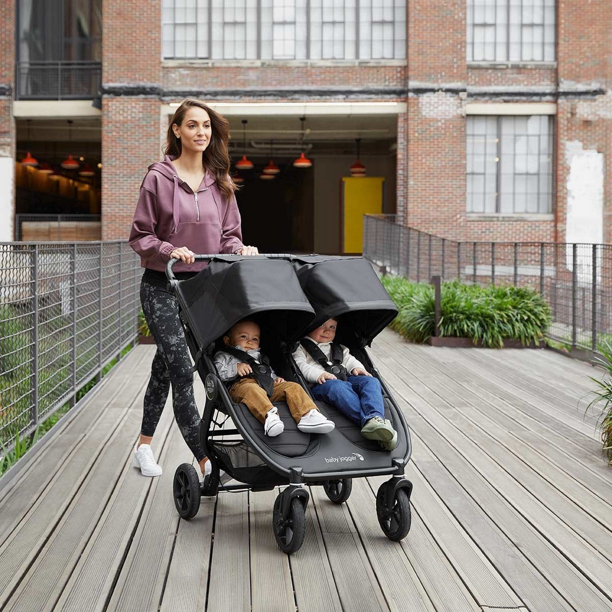 The Baby Jogger® City Mini® GT2 Double Stroller makes transporting your children twice as easy. The City Mini GT2 comfortably seats two in reclining, side-by-side seats with adjustable calf support. Forever Air rubber tires and all-wheel suspension guarantee stability and agility, and the stroller’s hand-operated parking brake makes it easy to stop your stroller at a moments’ notice. The stroller also features a one-hand fold and built-in auto lock, making transportation and storage simple and effortless.