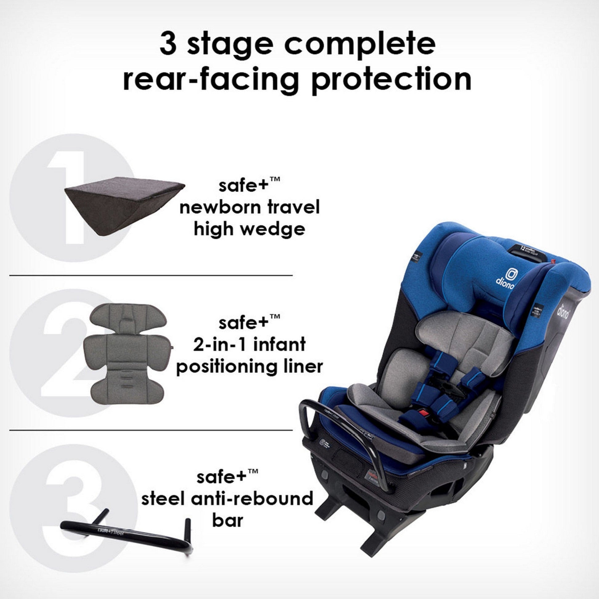 - 3 STAGE REAR FACING PROTECTION: Features Safe+™ newborn travel high wedge, Safe+™ 2-in-1 infant positioning liner and Safe+™ steel anti-rebound bar for complete rear-facing protection.