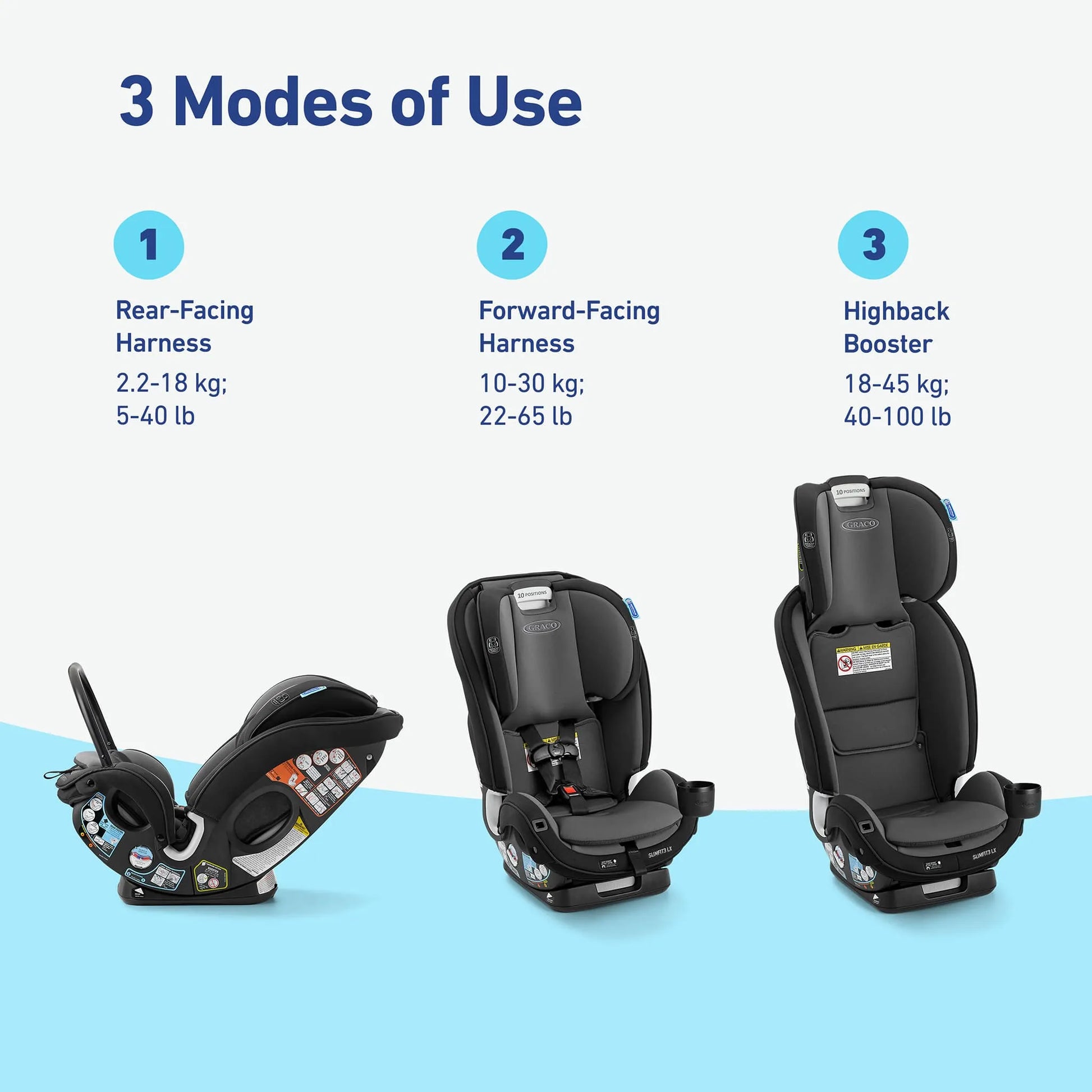 The Graco® True3Fit™ LX 3-in-1 Car Seat is our slimmest design that fits 3 car seats across, saving space in your back seat without compromising on the safety you trust and the features you need. This all-in-one car seat grows with your child from rear-facing harness (5-40 lb.) to forward-facing harness (22-65 lb.) to high-back booster (40-100 lb.). We tested our lightweight 3-across car seat in every configuration, to help ensure your growing family can fit in your vehicle, even with children of different ages who ride in different modes, or when paired with select other Graco car seats.