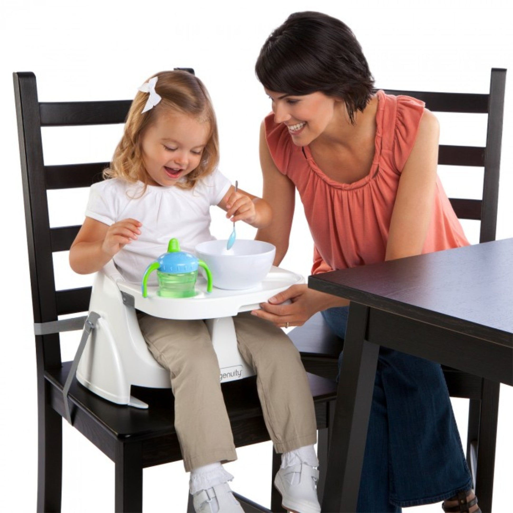 The Ingenuity Baby Base 2-in-1 Booster Seat easily attaches to dining chairs so your baby can sit up higher and see more during family dinners. This portable baby feeding seat works just as well sitting with you at the table or as a floor seat during playtime. The removable tray gives your baby her own perfectly sized table, so snacks or toys are easily within reach. When not in use, the tray conveniently tucks away right underneath the booster seat itself. As your baby grows, you can remove the foam seat insert and convert the baby booster into a toddler seat. For all those meals in between, you can count on the wipeable seat and dishwasher-safe tray to leave you more time for family catch-up and less for kitchen clean-up.